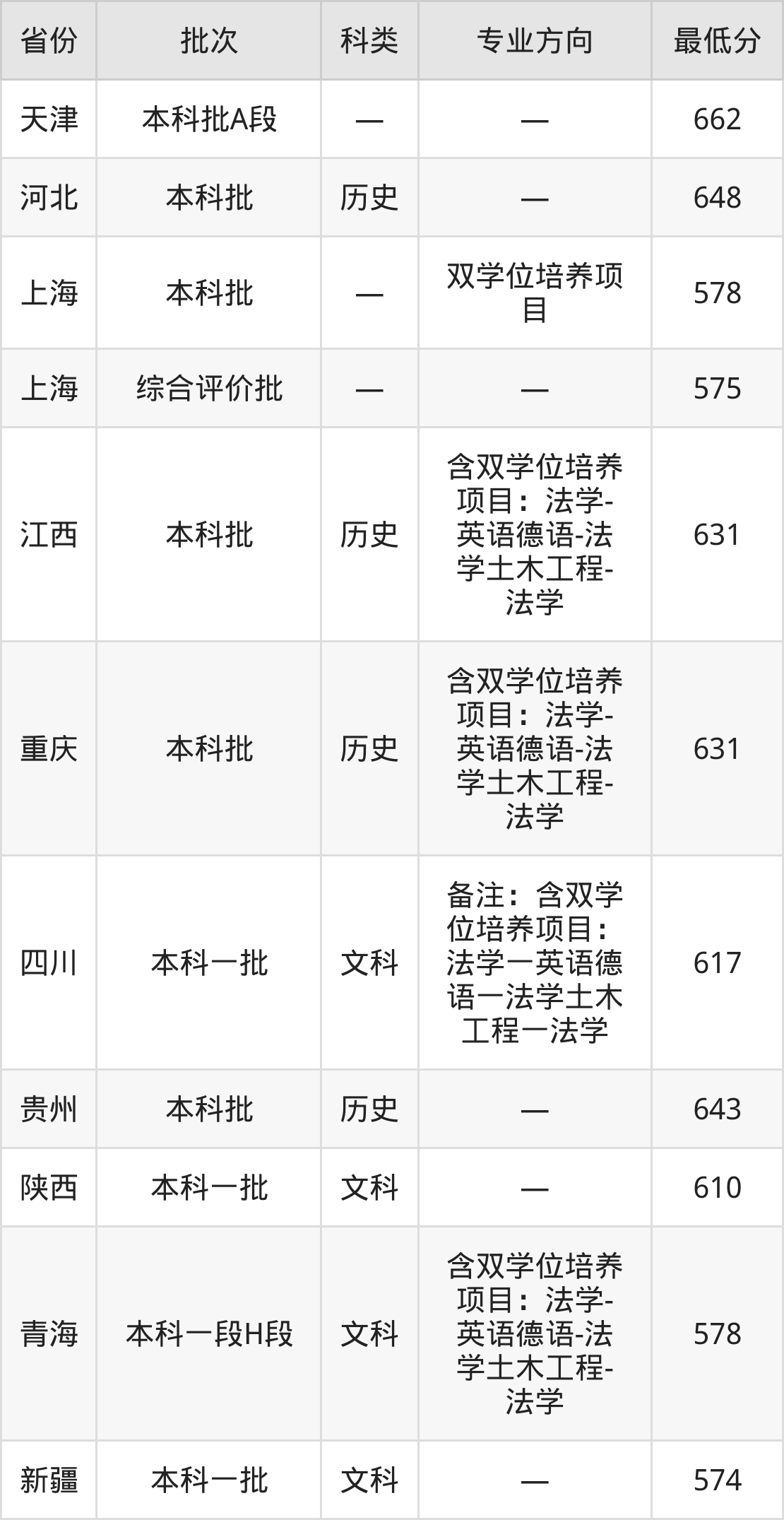 同济大学法学专业录取分数线从574分到662分不等,最低分数线如下: