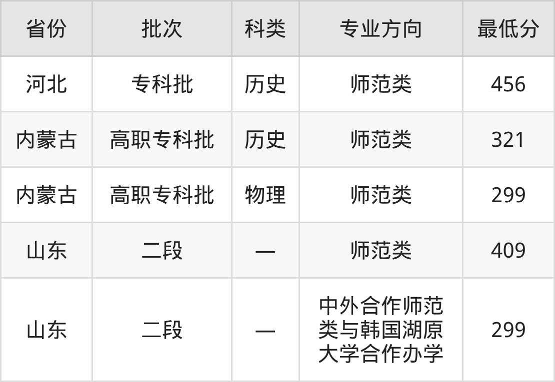淄博师范高等专科学校学前教育专业录取分数线从299分到456分不等,最低分数线如下: