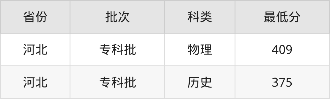 河北工业职业技术大学现代家政服务与管理专业录取分数线从375分到409分不等,最低分数线如下: