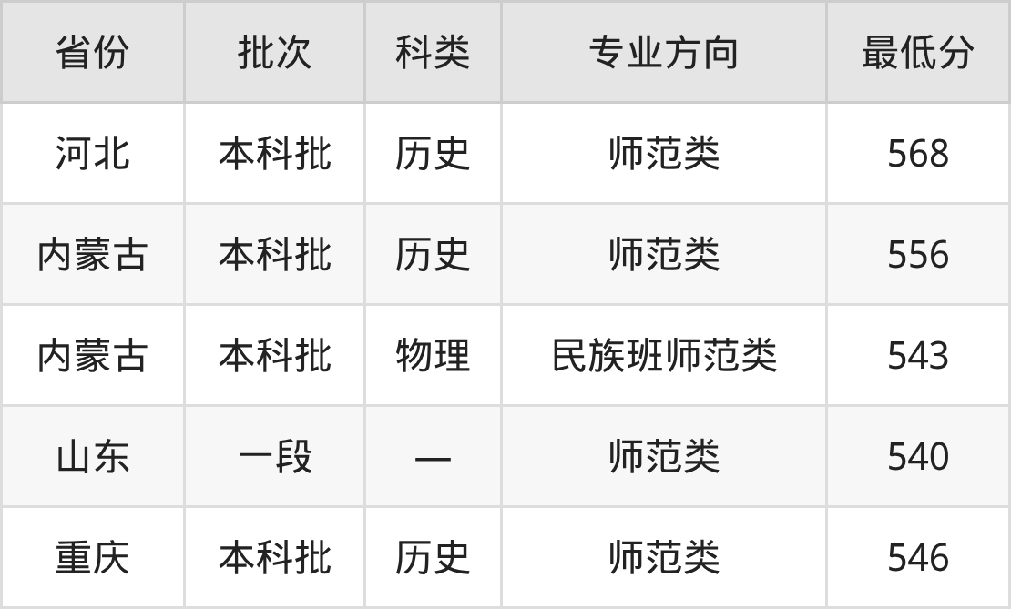 西北师范大学心理学类专业录取分数线从540分到568分不等,最低分数线如下: