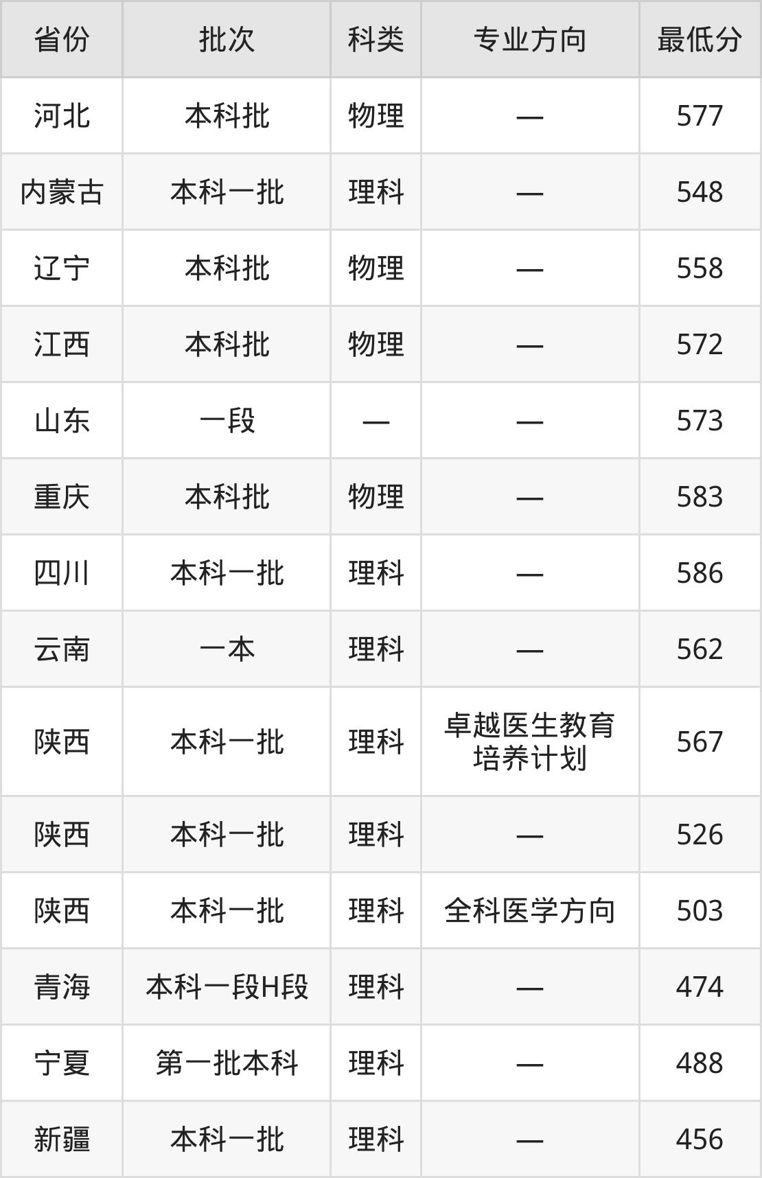 西安医学院临床医学专业录取分数线从456分到586分不等,在部分地区的最低分数线如下: