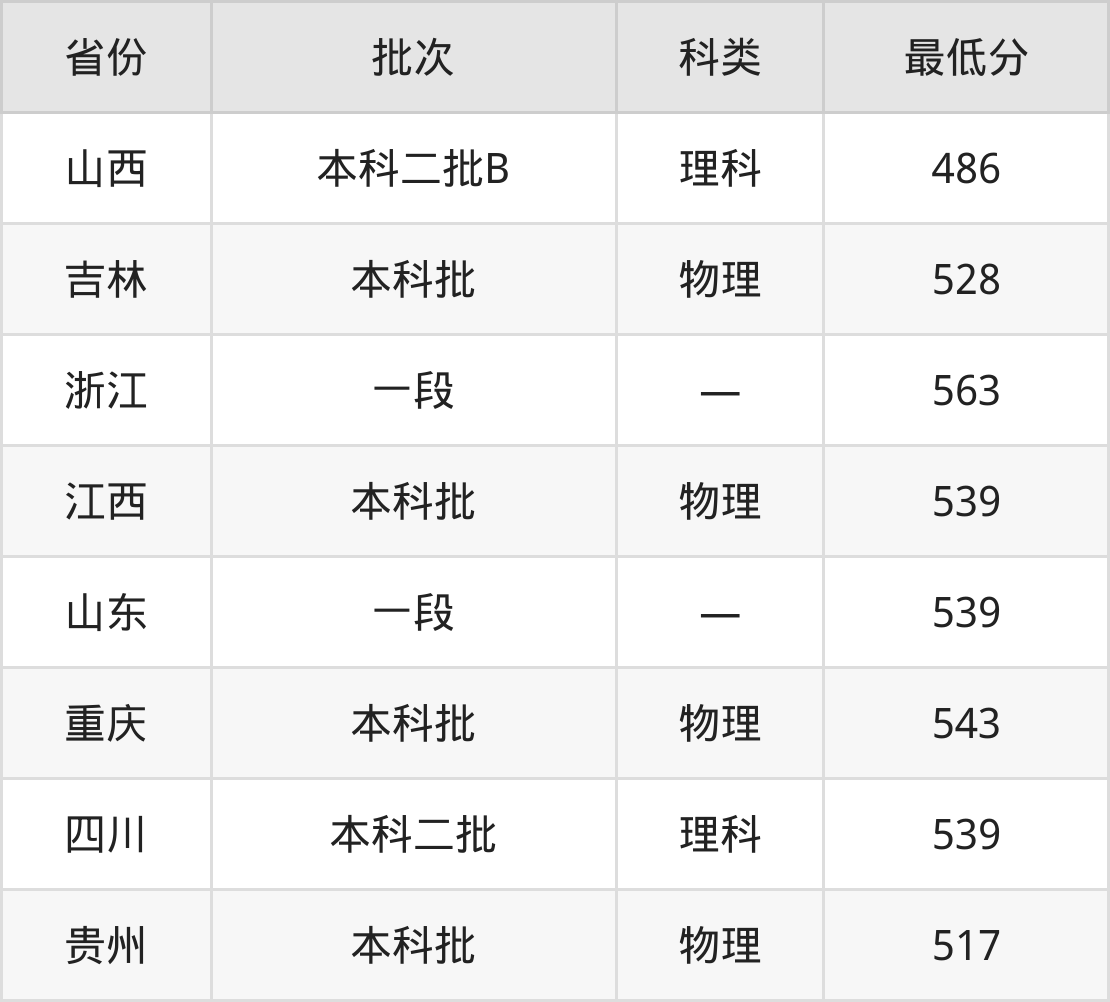 无锡学院自动化专业在全国各省最低录取分数线为486分(山西理科),除此之外,在其余地区的最低分为山东539分、重庆物理类543分、四川理科539分、贵州物理类517分等,以上数据均为2024年数据,供2025年高考生参考。