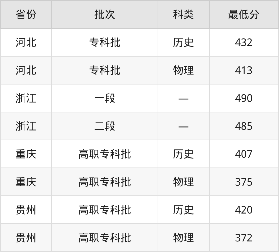 赣南卫生健康职业学院护理专业在全国各省最低录取分数线为372分(贵州物理类),除此之外,在其余地区的最低分为河北物理类413分、浙江485分、重庆物理类375分,以上数据均为2025年数据,供2026年高考生参考。
