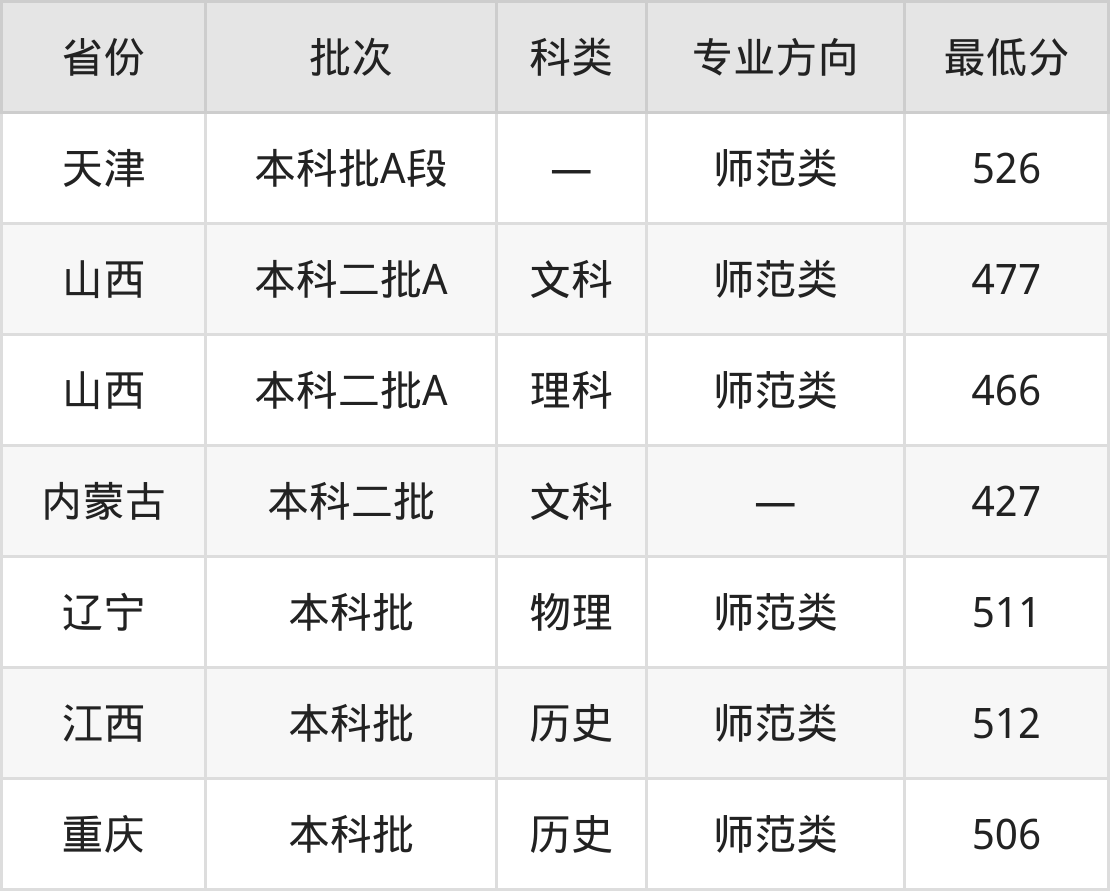 忻州师范学院小学教育专业录取分数线从427分到526分不等,最低分数线如下:
