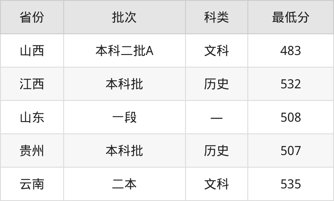 岭南师范学院工商管理专业在全国各省最低录取分数线为483分(山西文科),除此之外,在其余地区的最低分为云南文科535分、江西历史类532分、山东508分、贵州历史类507分,以上数据均为2024年数据,供2025年高考生参考。