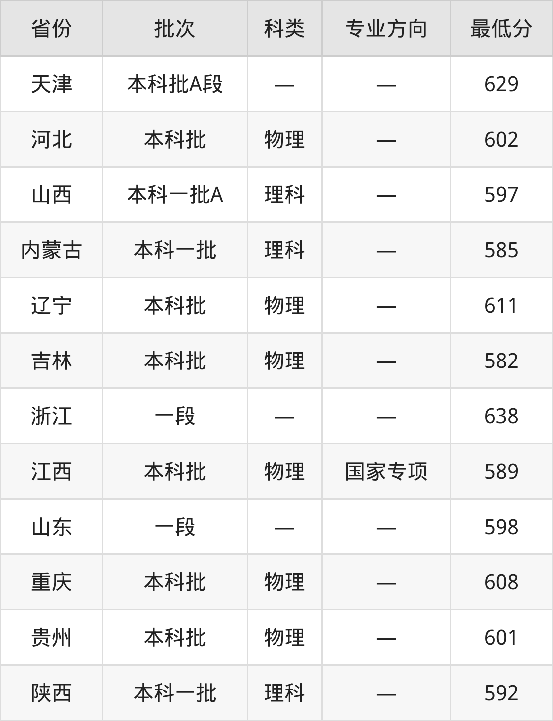 中国矿业大学新能源材料与器件专业录取分数线从582分到638分不等,在部分地区的最低分数线如下: