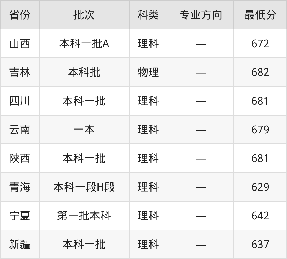 中国科学技术大学物理学类专业录取分数线从629分到682分不等,最低分数线如下:
