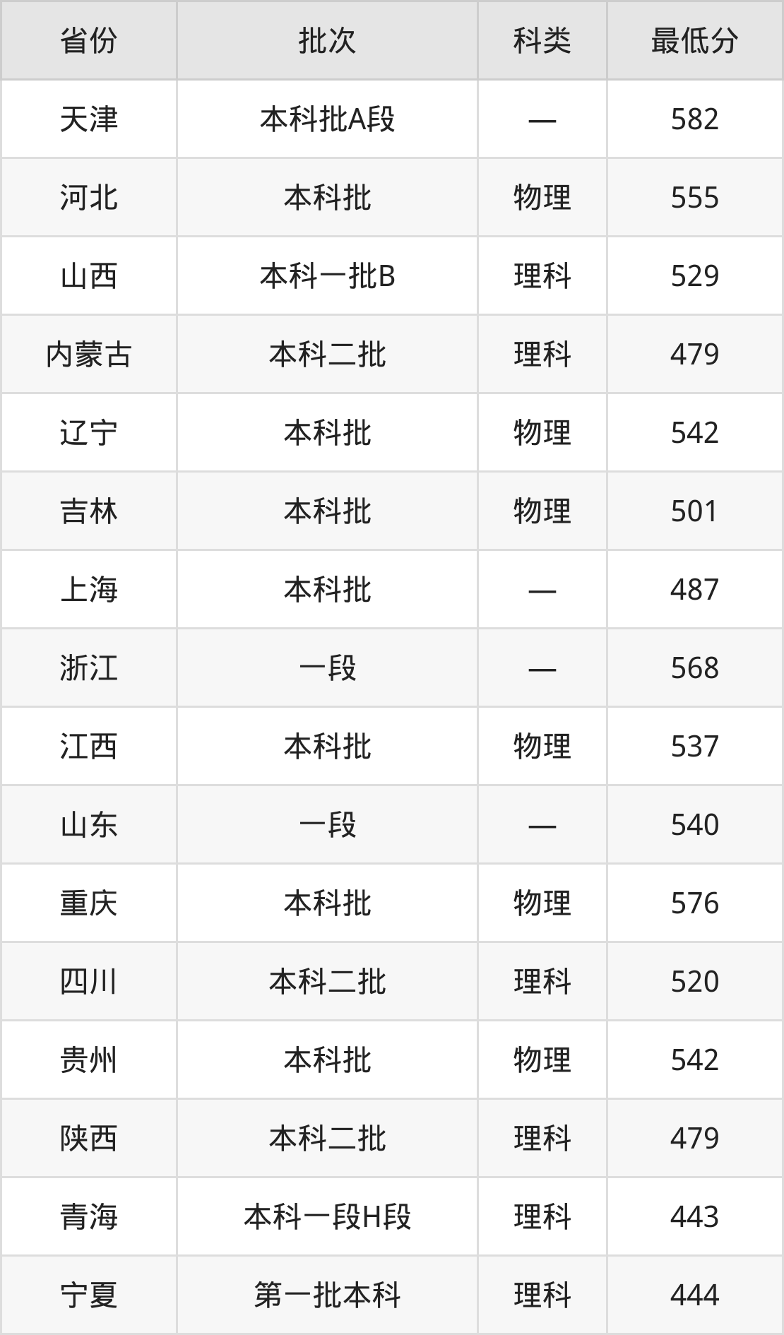 大理大学临床医学专业录取分数线从443分到582分不等,在部分地区的最低分数线如下: