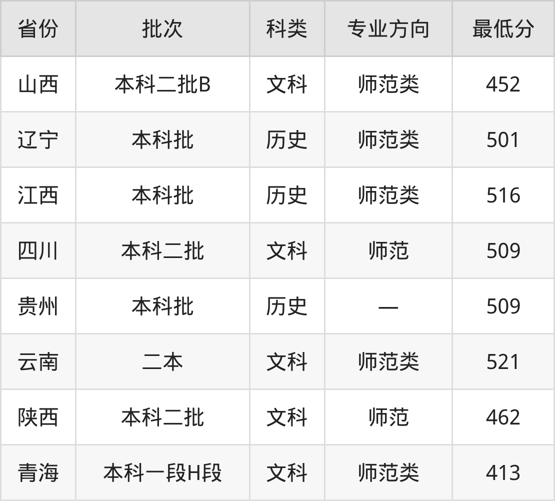 海南热带海洋学院历史学专业在全国各省最低录取分数线为413分(青海文科),除此之外,在其余地区的最低分为贵州历史类509分、云南文科521分、陕西文科462分、山西文科452分等,以上数据均为2024年数据,供2025年高考生参考。