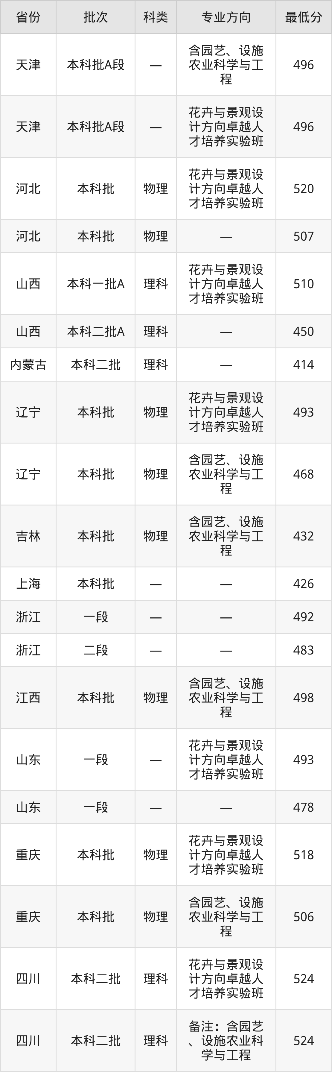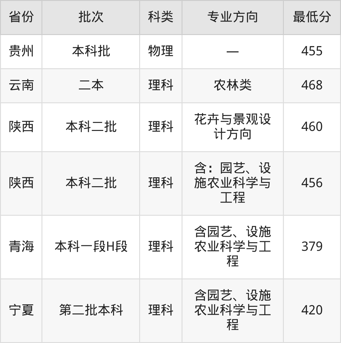 山西农业大学园艺专业录取分数线从379分到524分不等,在部分地区的最低分数线如下: