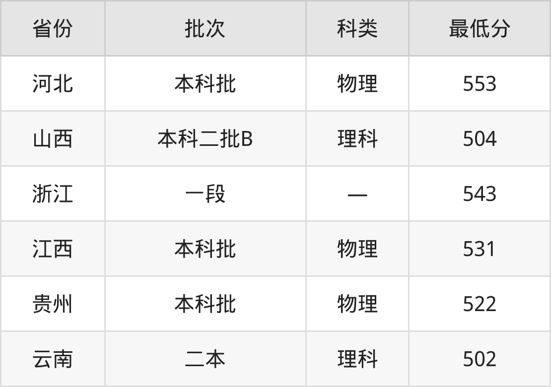 台州学院临床医学专业在全国各省最低录取分数线为502分(云南理科),除此之外,在其余地区的最低分为浙江543分、江西物理类531分、贵州物理类522分、河北物理类553分等,以上数据均为2024年数据,供2025年高考生参考。