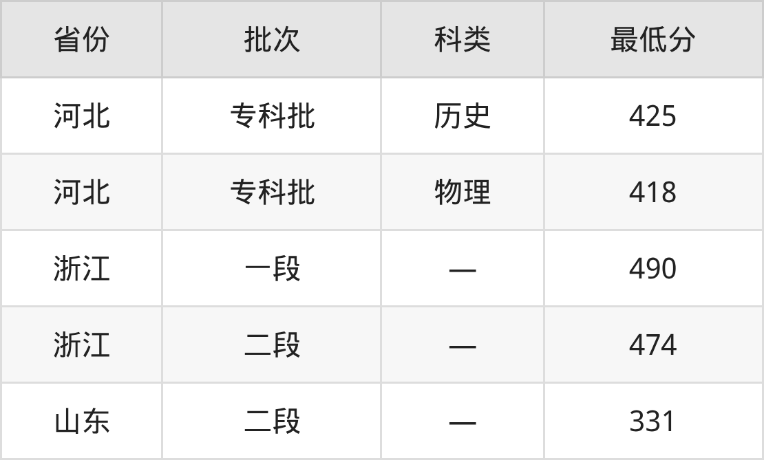 山东现代学院临床医学专业在全国各省最低录取分数线为331分(山东),除此之外,在其余地区的最低分为河北物理类418分、浙江474分,以上数据均为2025年数据,供2026年高考生参考。