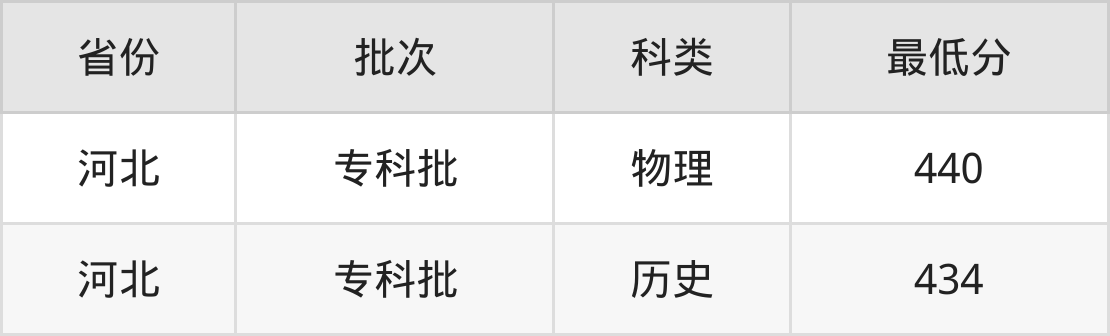河北工业职业技术大学智能网联汽车技术专业录取分数线从434分到440分不等,最低分数线如下: