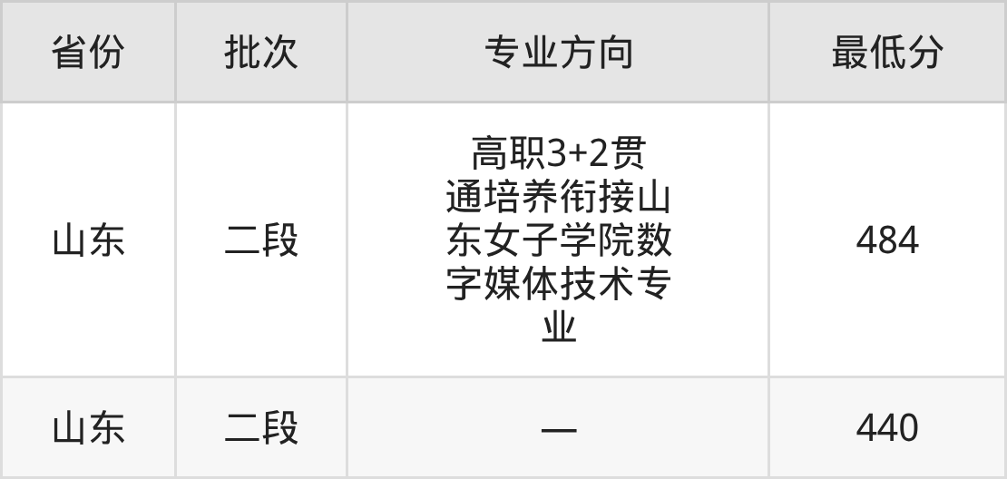 山东电子职业技术学院数字媒体技术专业录取分数线从440分到484分不等,最低分数线如下: