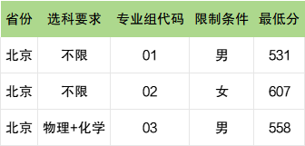 再比如在北京市,陆军勤务学院录取最低分是531分,但这只是001组男生的最低分,如果是003组女生的话,最低分高达607分。