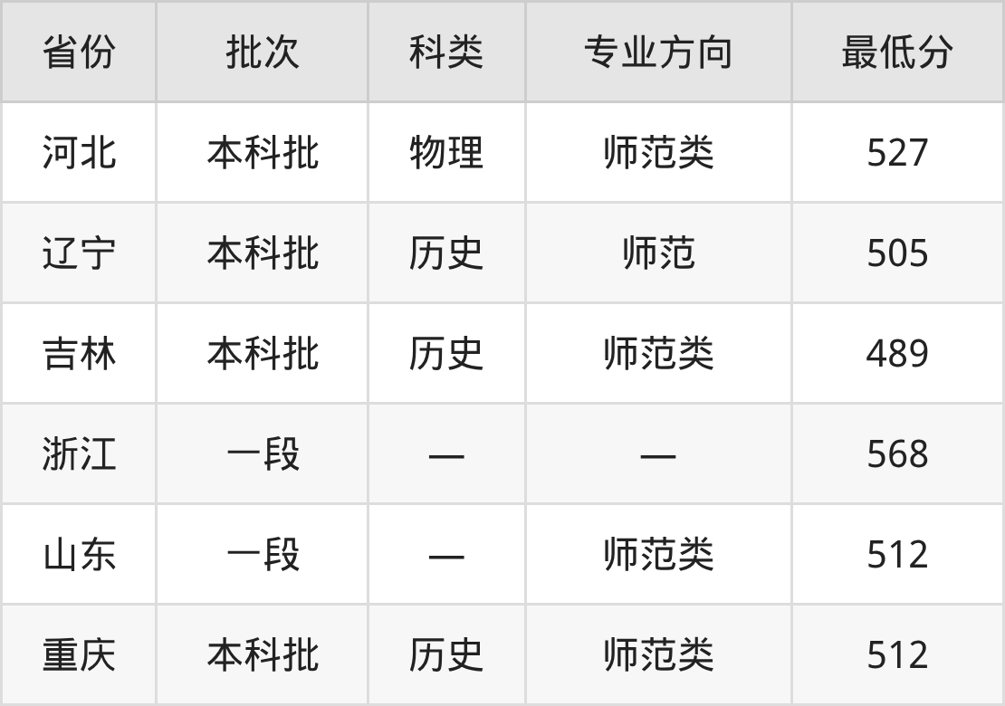 天水师范大学英语专业在全国各省最低录取分数线为489分(吉林历史类),除此之外,在其余地区的最低分为河北物理类527分、辽宁历史类505分、浙江568分、山东512分等,以上数据均为2025年数据,供2026年高考生参考。