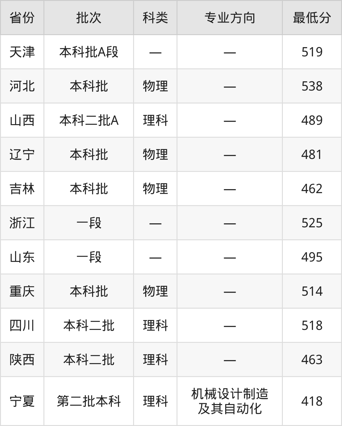 太原工业学院机械设计制造及其自动化专业录取分数线从418分到538分不等,在部分地区的最低分数线如下: