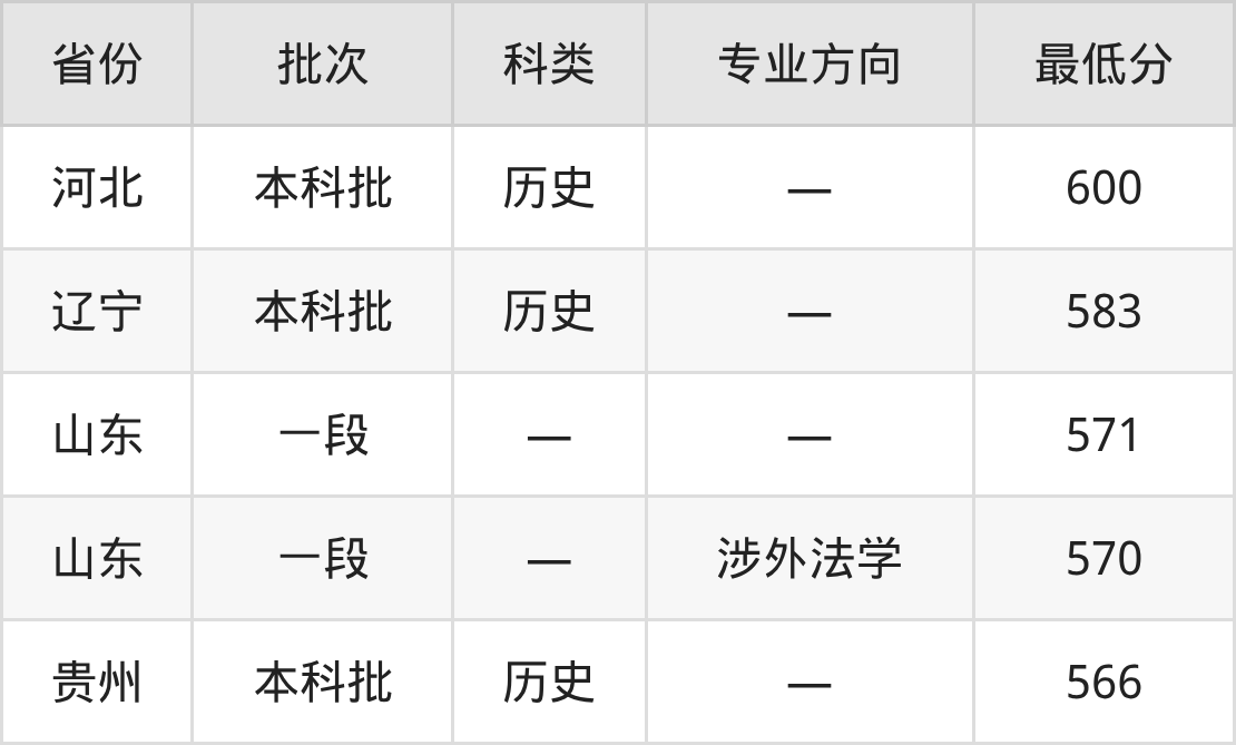 曲阜师范大学法学专业录取分数线从566分到600分不等,最低分数线如下: