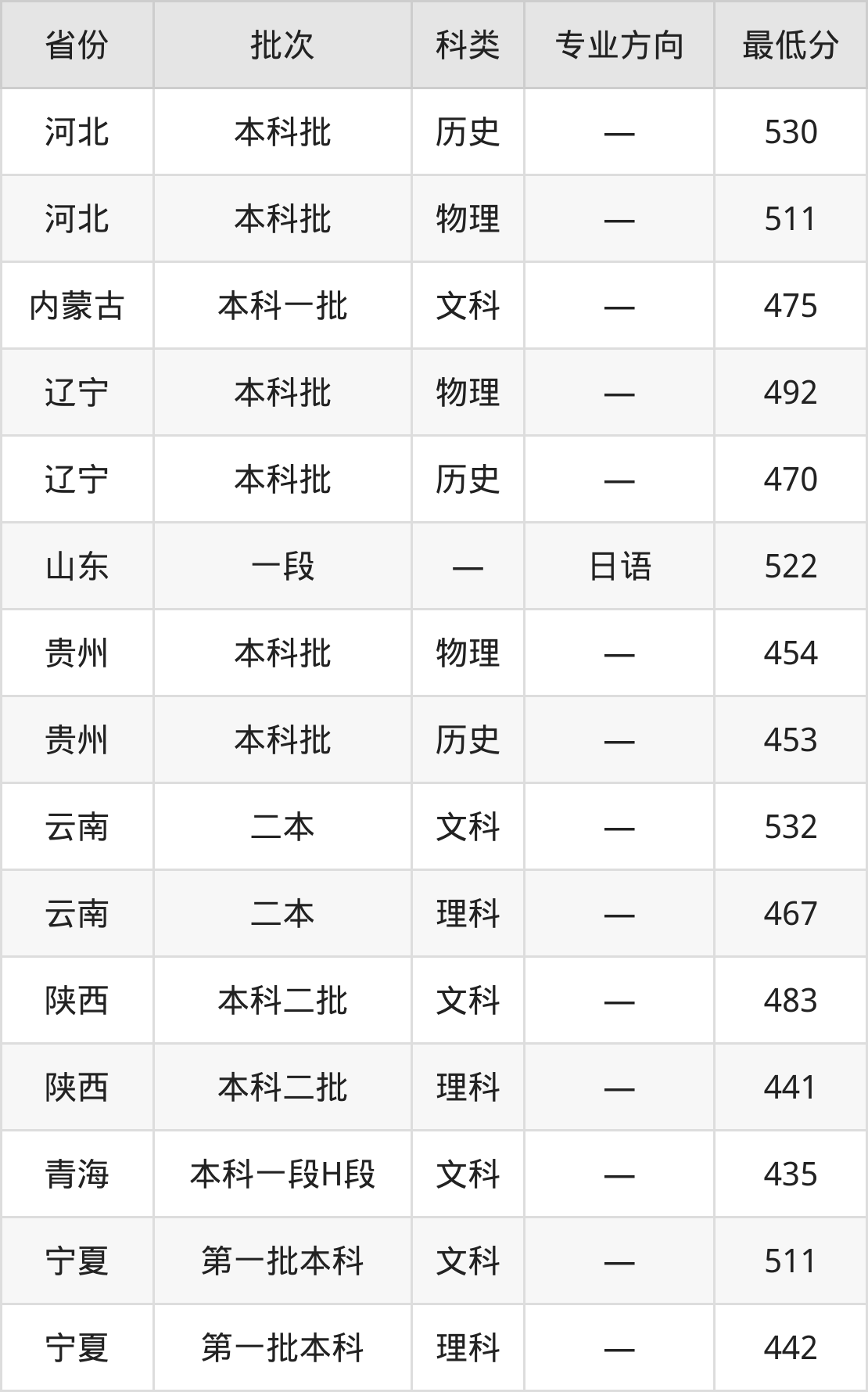 北方民族大学阿拉伯语专业在全国各省录取分数线: