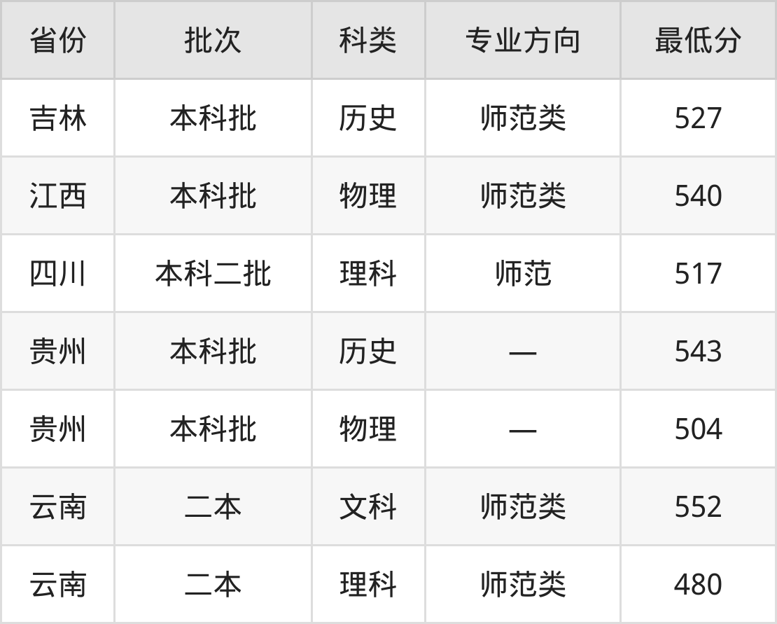 闽南师范大学地理科学专业在全国各省最低录取分数线为480分(云南理科),除此之外,在其余地区的最低分为吉林历史类527分、江西物理类540分、四川理科517分、贵州物理类504分,以上数据均为2024年数据,供2025年高考生参考。