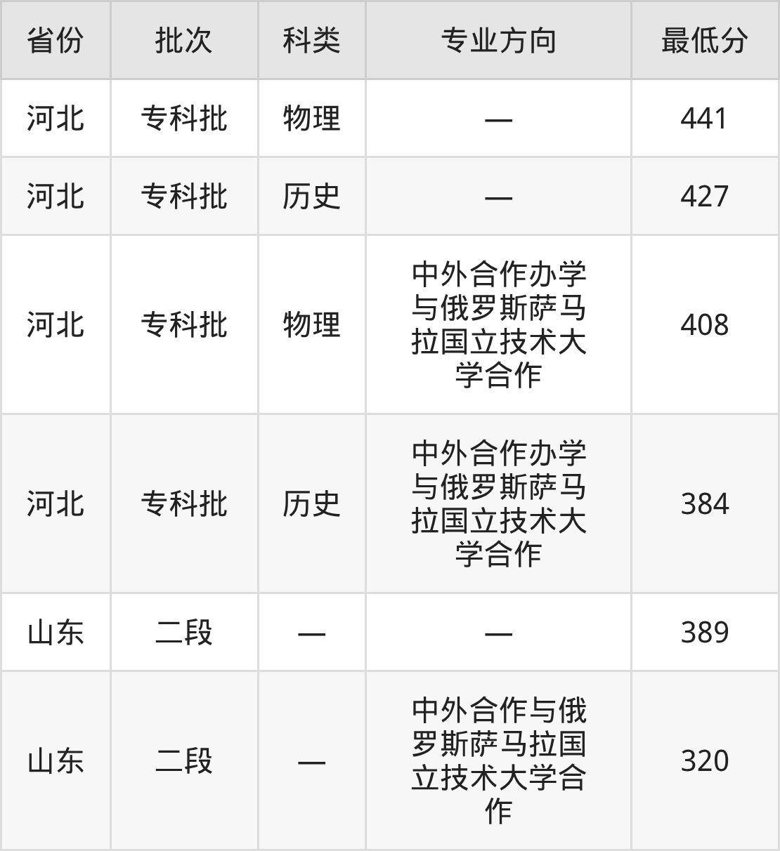 东营科技职业学院机械制造及自动化专业录取分数线从320分到441分不等,最低分数线如下: