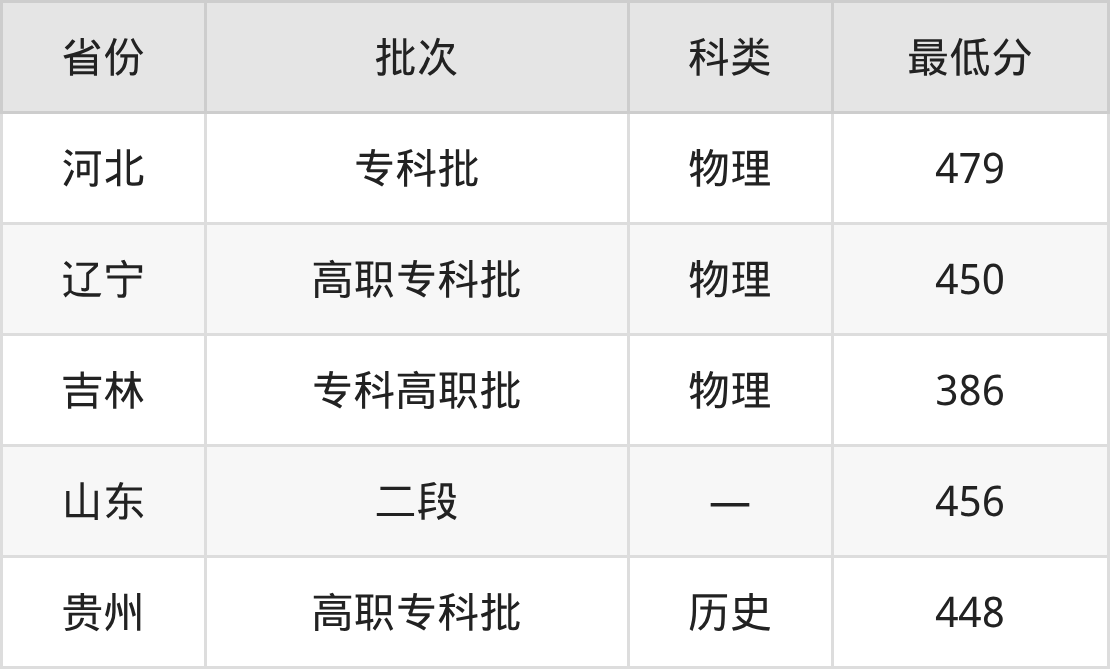 天津铁道职业技术学院高速铁路综合维修技术专业在全国各省最低录取分数线为386分(吉林物理类),除此之外,在其余地区的最低分为辽宁物理类450分、山东456分、贵州历史类448分、河北物理类479分,以上数据均为2025年数据,供2026年高考生参考。
