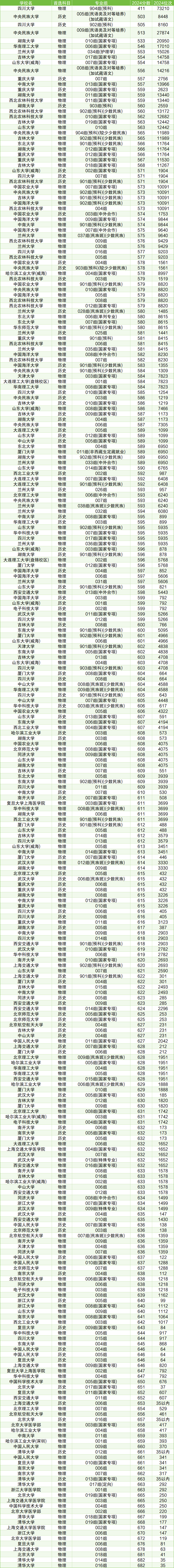 以物理类为例,考生可报考的最低分强基计划大学有西北农林科技大学(国家专项计划),2024年最低分均为566分,位次范围在43-18481名之间。