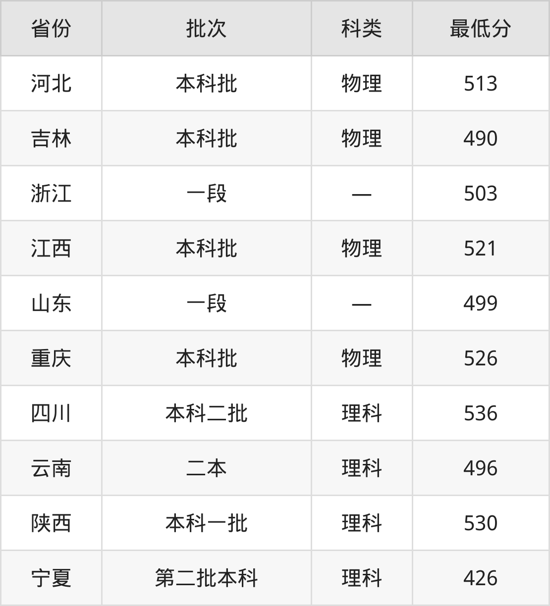 海南医科大学生物技术专业在全国各省最低录取分数线为426分(宁夏理科),除此之外,在其余地区的最低分为吉林物理类490分、浙江503分、陕西理科530分、河北物理类513分等,以上数据均为2024年数据,供2025年高考生参考。