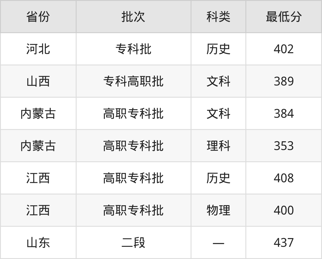 呼和浩特职业学院铁道交通运营管理专业在全国各省最低录取分数线为353分(内蒙古理科),除此之外,在其余地区的最低分为河北历史类402分、山西文科389分、江西物理类400分、山东437分,以上数据均为2024年数据,供2025年高考生参考。