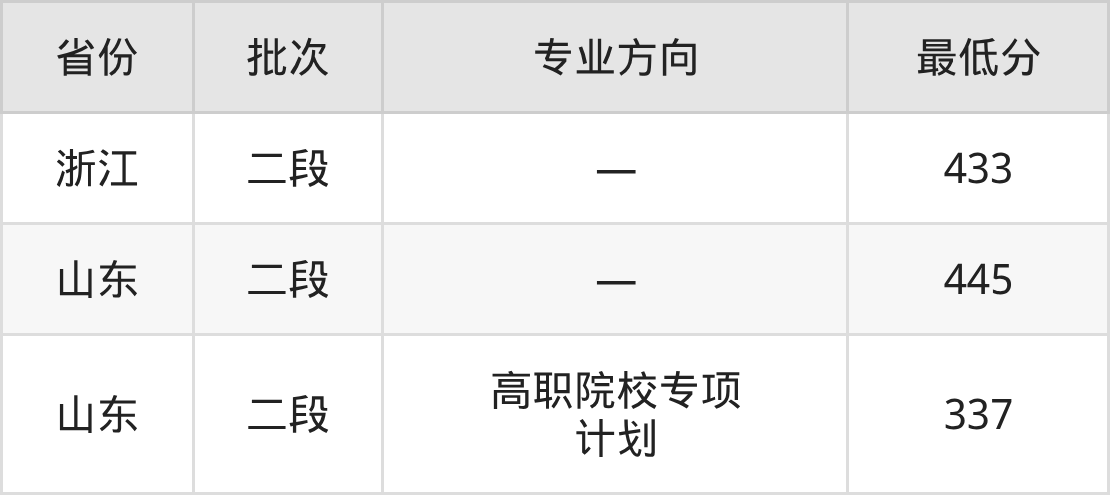 山东商业职业技术学院电子商务专业在全国各省最低录取分数线为337分(山东),除此之外,在其余地区的最低分为浙江433分,以上数据均为2025年数据,供2026年高考生参考。