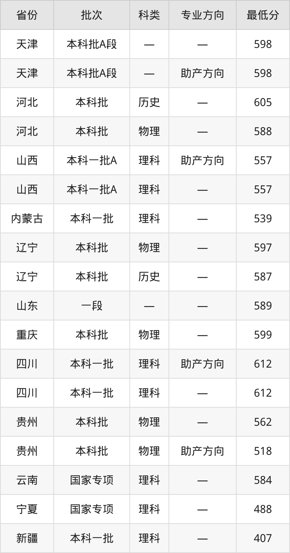 天津医科大学护理学专业录取分数线从407分到612分不等,在部分地区的最低分数线如下:
