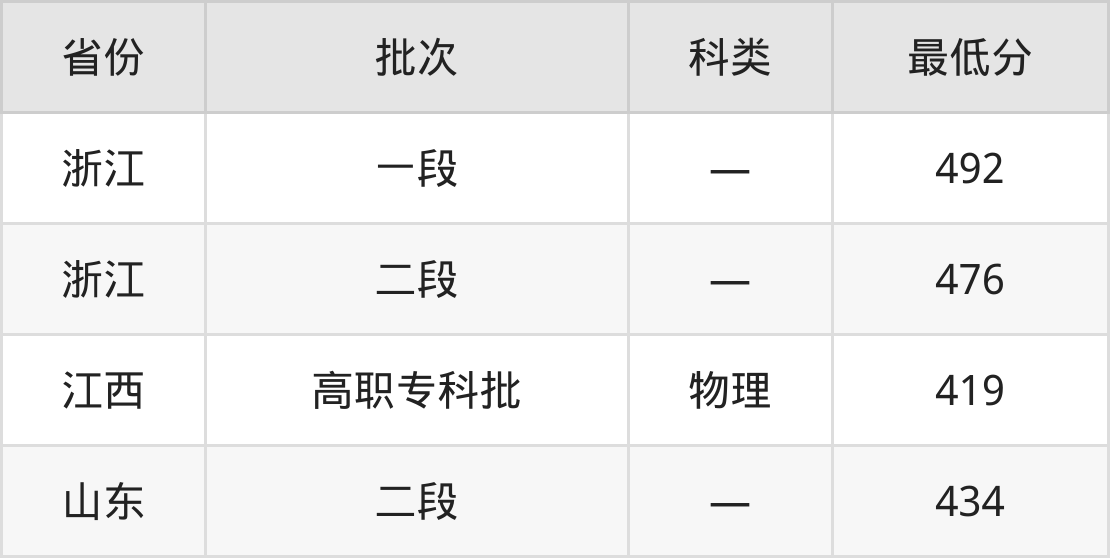 湖州职业技术学院机电一体化技术专业录取分数线从419分到492分不等,最低分数线如下: