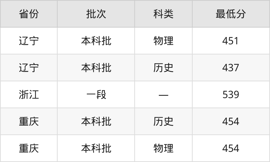 重庆对外经贸学院日语专业在全国各省最低录取分数线为437分(辽宁历史类),除此之外,在其余地区的最低分为浙江539分、重庆历史类454分,以上数据均为2024年数据,供2025年高考生参考。
