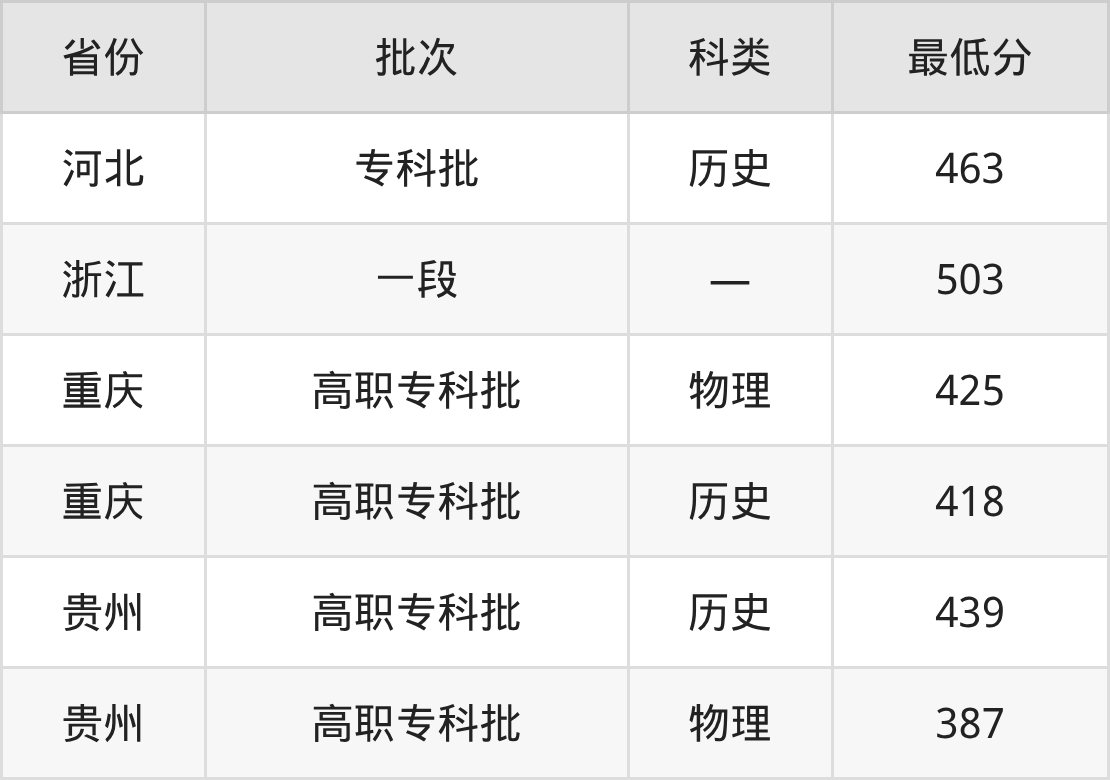 永州职业技术学院护理专业在全国各省最低录取分数线为387分(贵州物理类),除此之外,在其余地区的最低分为重庆历史类418分、河北历史类463分、浙江503分,以上数据均为2025年数据,供2026年高考生参考。