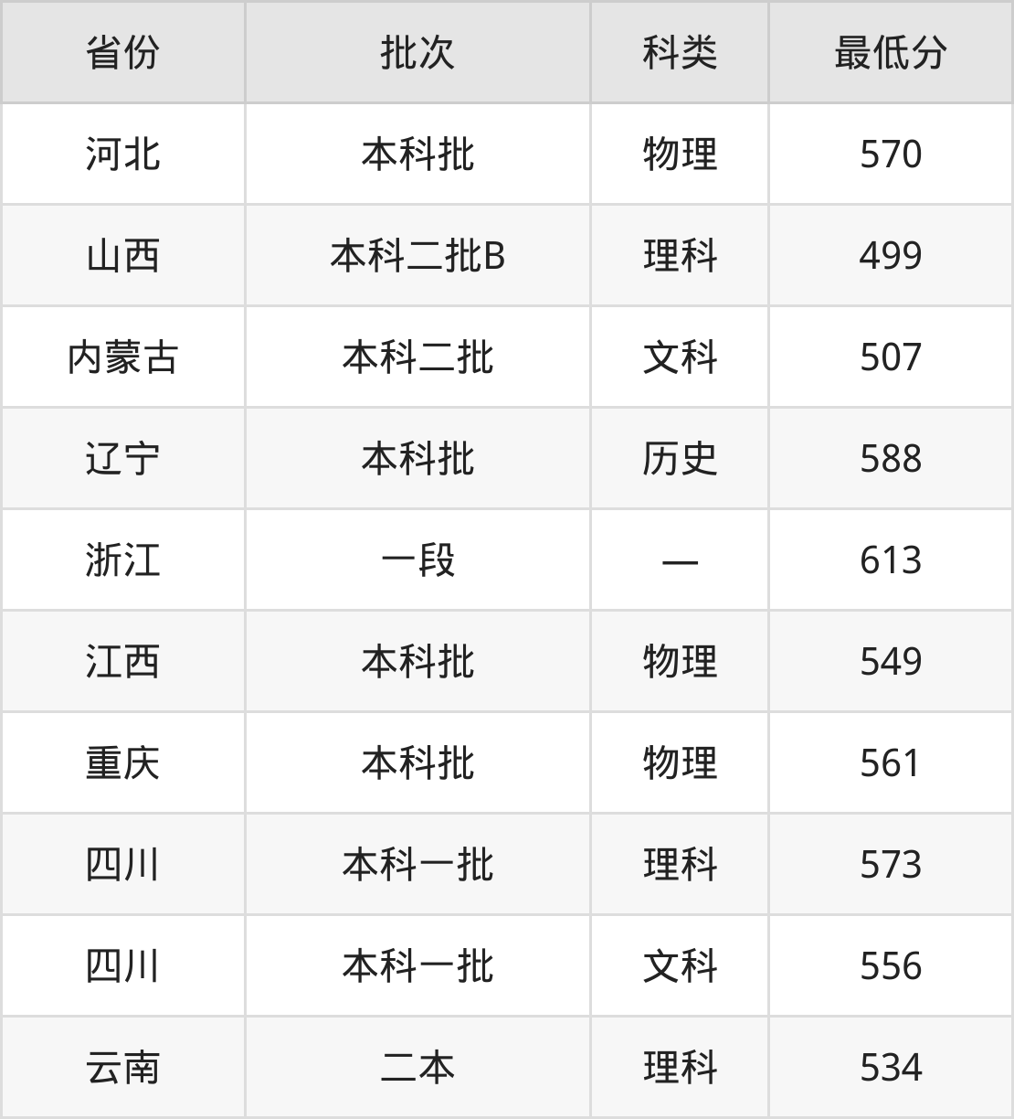 成都大学法学专业录取分数线从499分到613分不等,最低分数线如下: