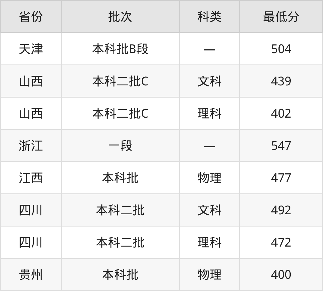 浙江财经大学东方学院税收学专业在全国各省最低录取分数线为400分(贵州物理类),除此之外,在其余地区的最低分为天津504分、山西理科402分、浙江547分、江西物理类477分等,以上数据均为2024年数据,供2025年高考生参考。