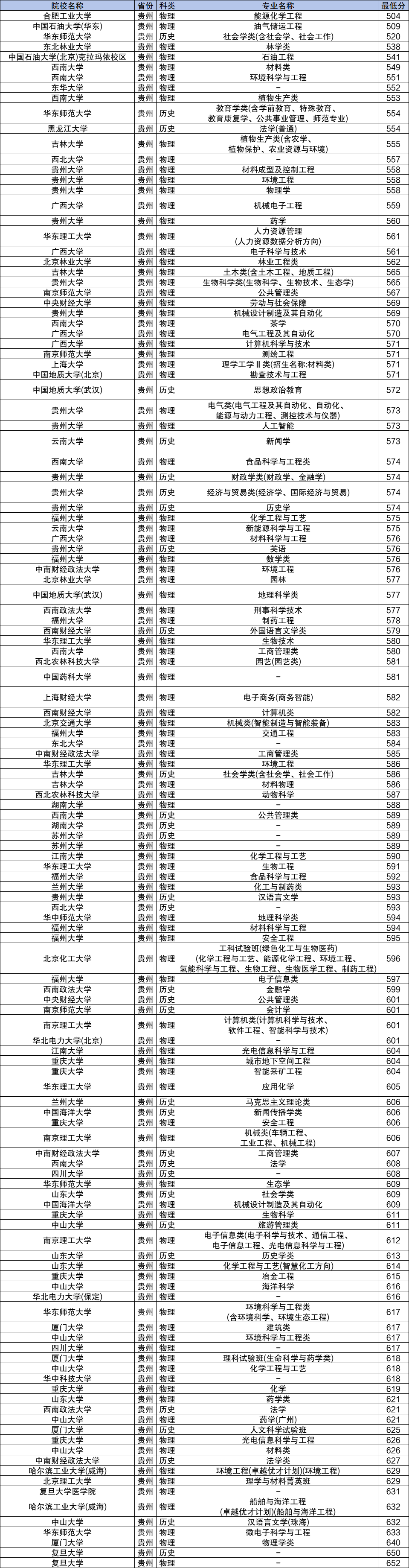 以贵州大学为例,历史类各个专业最低分数线如下: