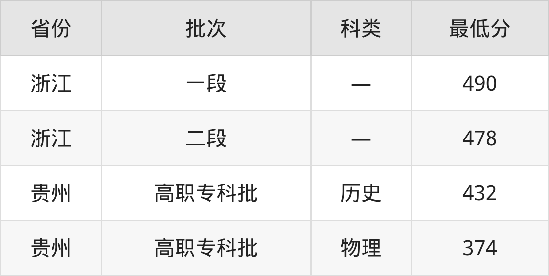 江西交通职业技术学院城市轨道车辆应用技术专业在全国各省最低录取分数线为374分(贵州物理类),除此之外,在其余地区的最低分为浙江478分,以上数据均为2025年数据,供2026年高考生参考。
