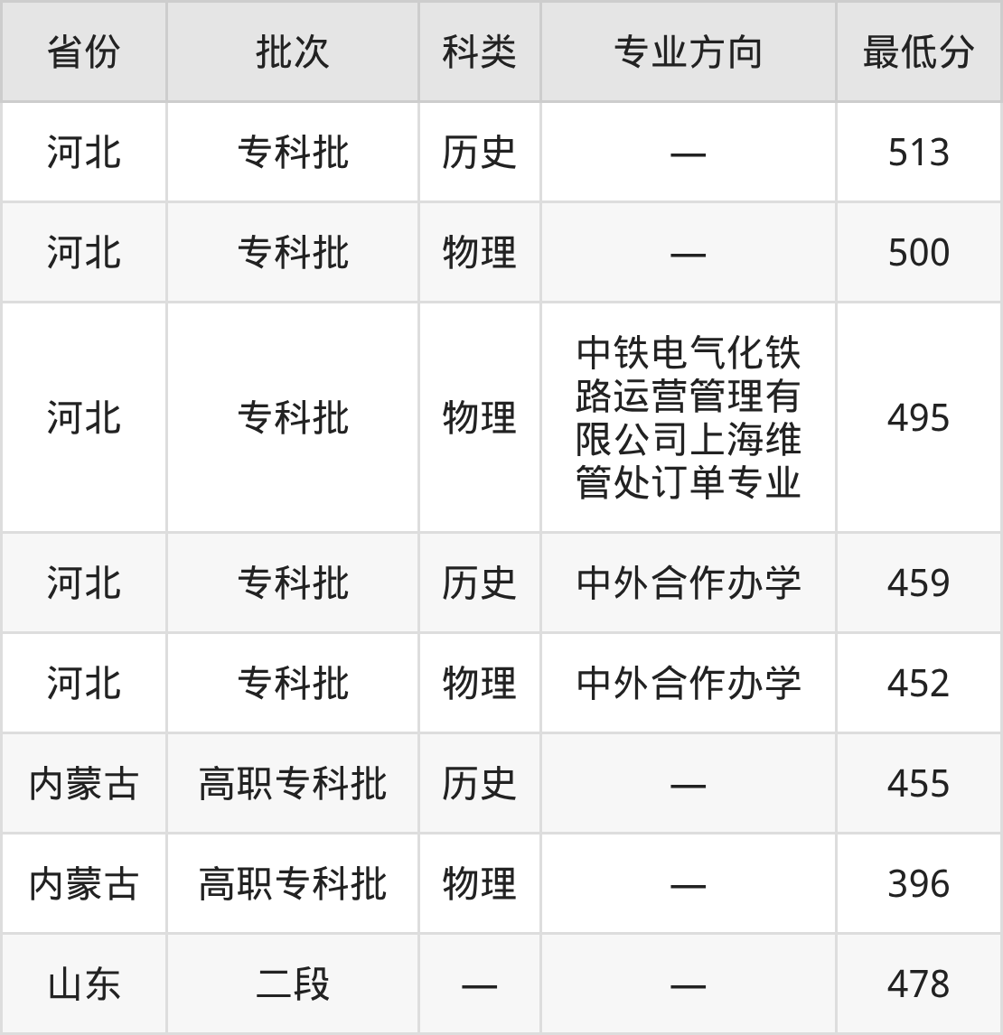 石家庄铁路职业技术学院铁道供电技术专业录取分数线从396分到513分不等,最低分数线如下: