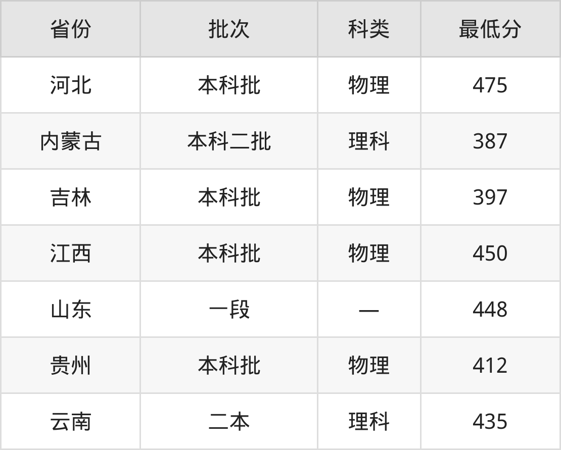 南昌交通学院车辆工程专业在全国各省最低录取分数线为387分(内蒙古理科),除此之外,在其余地区的最低分为河北物理类475分、吉林物理类397分、江西物理类450分、山东448分等,以上数据均为2024年数据,供2025年高考生参考。