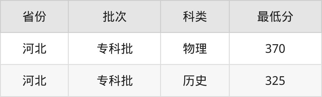 石家庄工商职业学院婴幼儿托育服务与管理专业录取分数线从325分到370分不等,最低分数线如下: