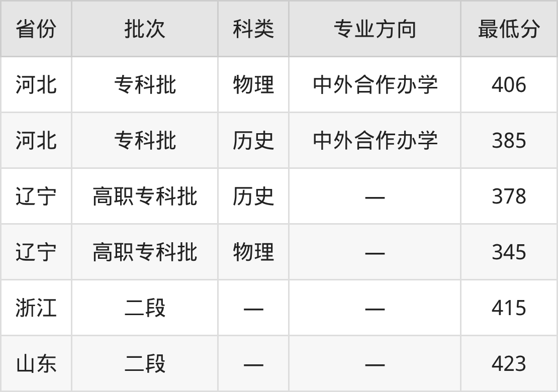 江西工业贸易职业技术学院大数据与会计专业在全国各省最低录取分数线为345分(辽宁物理类),除此之外,在其余地区的最低分为浙江415分、山东423分、河北历史类385分,以上数据均为2025年数据,供2026年高考生参考。