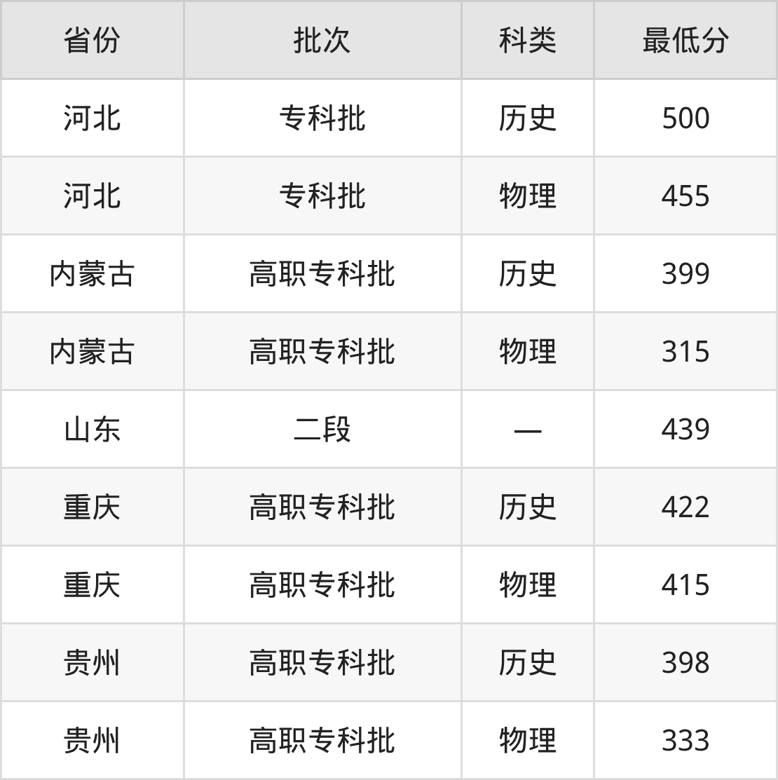 陕西能源职业技术学院护理专业在全国各省最低录取分数线为315分(内蒙古物理类),除此之外,在其余地区的最低分为河北物理类455分、山东439分、重庆物理类415分、贵州物理类333分,以上数据均为2025年数据,供2026年高考生参考。