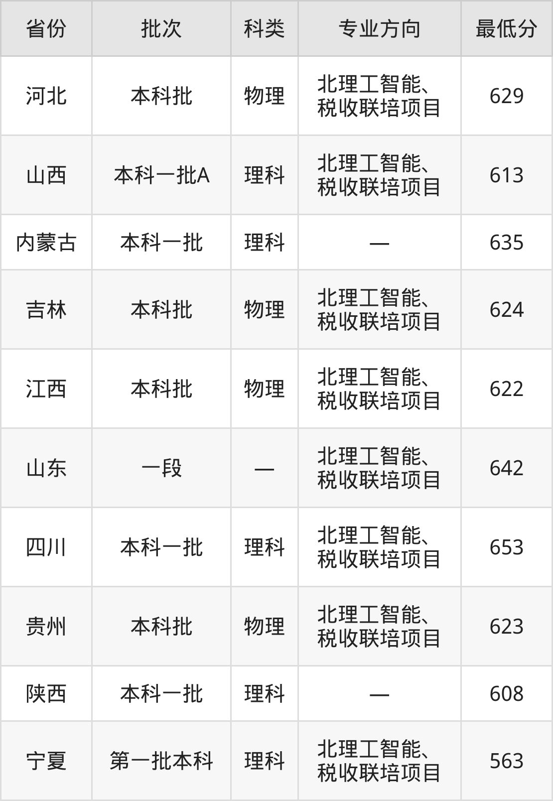 中央财经大学税收学专业在全国各省录取分数线: