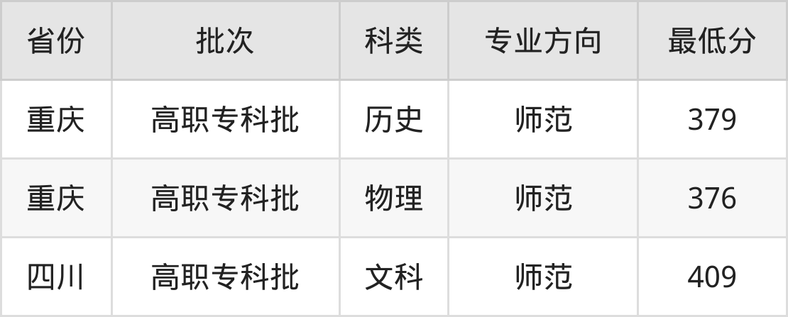 重庆工贸职业技术学院早期教育专业录取分数线从376分到409分不等,最低分数线如下:
