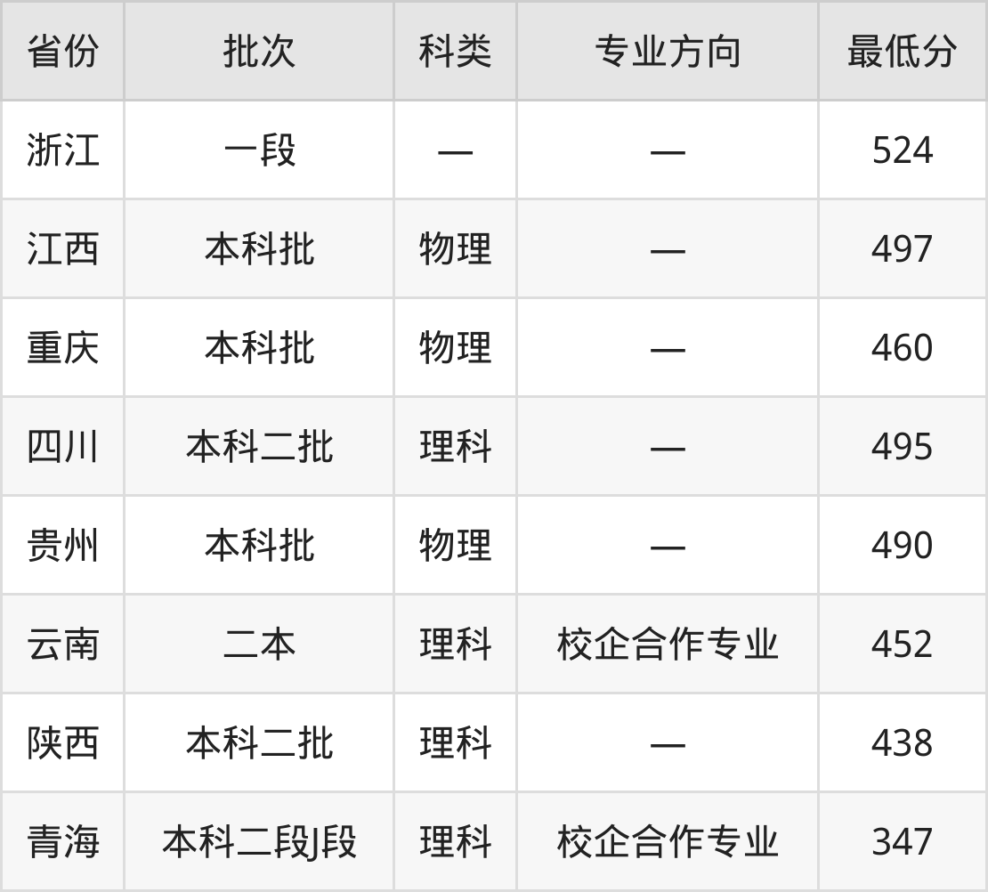重庆财经学院大数据管理与应用专业在全国各省最低录取分数线为347分(青海理科),除此之外,在其余地区的最低分为云南理科452分、陕西理科438分、浙江524分、江西物理类497分等,以上数据均为2024年数据,供2025年高考生参考。