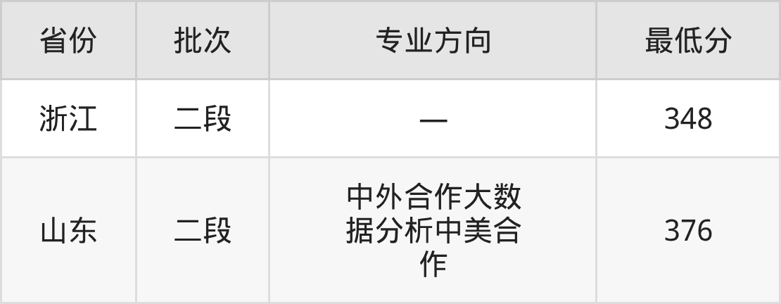上海工商外国语职业学院大数据技术专业在全国各省最低录取分数线为348分(浙江),除此之外,在其余地区的最低分为山东376分,以上数据均为2025年数据,供2026年高考生参考。