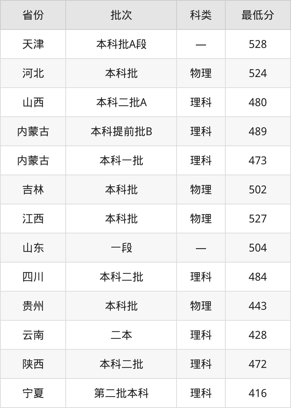 内蒙古医科大学护理学专业在全国各省最低录取分数线为416分(宁夏理科),除此之外,在其余地区的最低分为山东504分、贵州物理类443分、云南理科428分、山西理科480分等,以上数据均为2024年数据,供2025年高考生参考。
