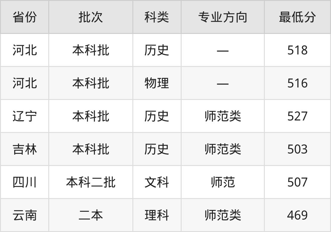 保定学院地理科学专业录取分数线从469分到527分不等,最低分数线如下: