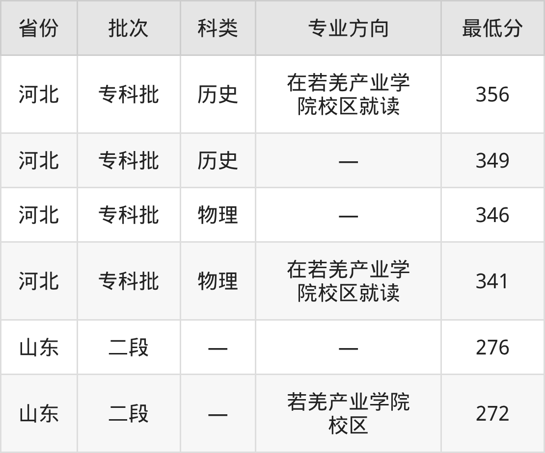 巴音郭楞职业技术学院安全技术与管理专业在全国各省最低录取分数线为272分(山东),除此之外,在其余地区的最低分为河北物理类341分,以上数据均为2025年数据,供2026年高考生参考。